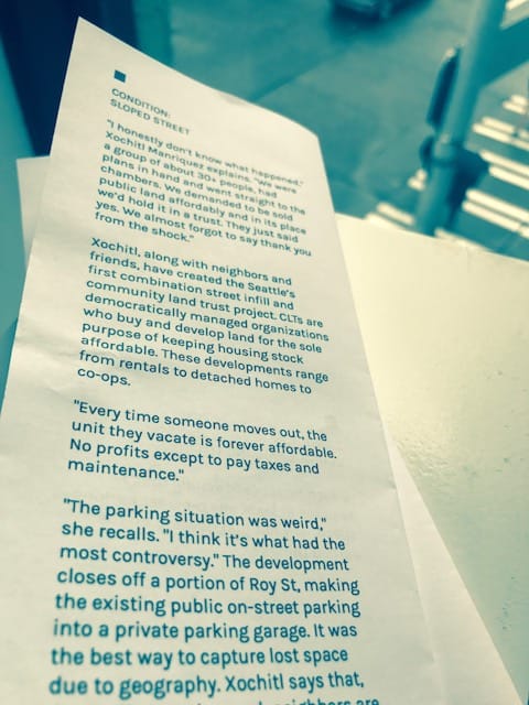 When you’re new to thinking about how to grow our cities, conversations feel exclusive and off putting to non-wonks. Seattle urbanists often talk about welcoming communities; Myra Lara’s exhibit was one of the most welcoming urban planning events I’ve attended.