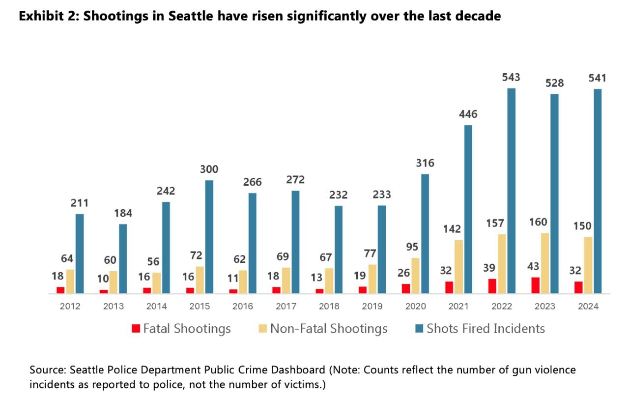 Shootings with non-fatal injuries increased by 150% and fatal shootings increased by 220% between 2013 and 2024, according to the Seattle Police Department (SPD). That troubling trend includes an increase in youth gun violence, with the number of youth gunshot victims doubling from 2019 to 2024, as the King County Prosecutor’s Office noted in its annual report.