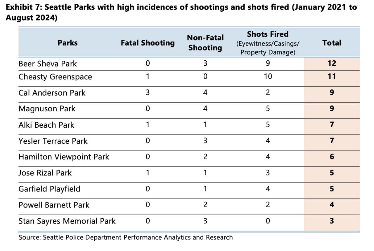 The King County Prosecuting Attorney’s Office’s (KCPAO’s) Crime Strategies Unit shared that in Seattle, shootings concentrate in and around parks and community centers. The Seattle Parks Department didn’t have a complete list of shootings that have happened in the parks, but SPD was able to create a custom report, generating a list of 11 parks that see a high incidence of shootings and could use extra attention.