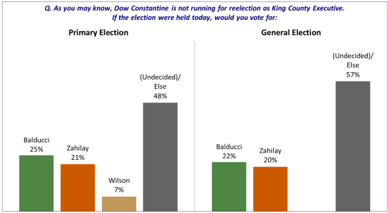 Among likely primary voters, the poll found Balducci led the field with 25% of the vote, compared to 21% for Zahilay and 7% for John Arthur Wilson, who is King County Assessor and running in a more conservative lane. Those candidates are the only three in the race with significant campaign operations and fundraising totals.