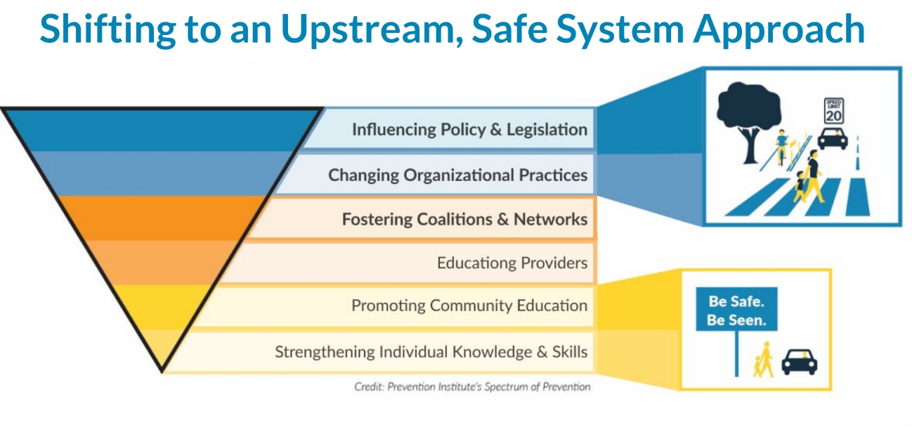 “With a Safe System approach, we really want to look more upstream,” Shahum said, noting an intentional shift toward policymaking and away from focusing on individual behaviors and intersections. “What we can do with a Safe Systems approach is, frankly, bring in more players and stakeholders. […] It’s not just a transportation problem or a transportation silo you’re working in; it is bringing in public policy folks. It is bringing in public health. It is bringing in your transit providers and school districts and others to really be working on this together, and to really be taking a different approach.”
