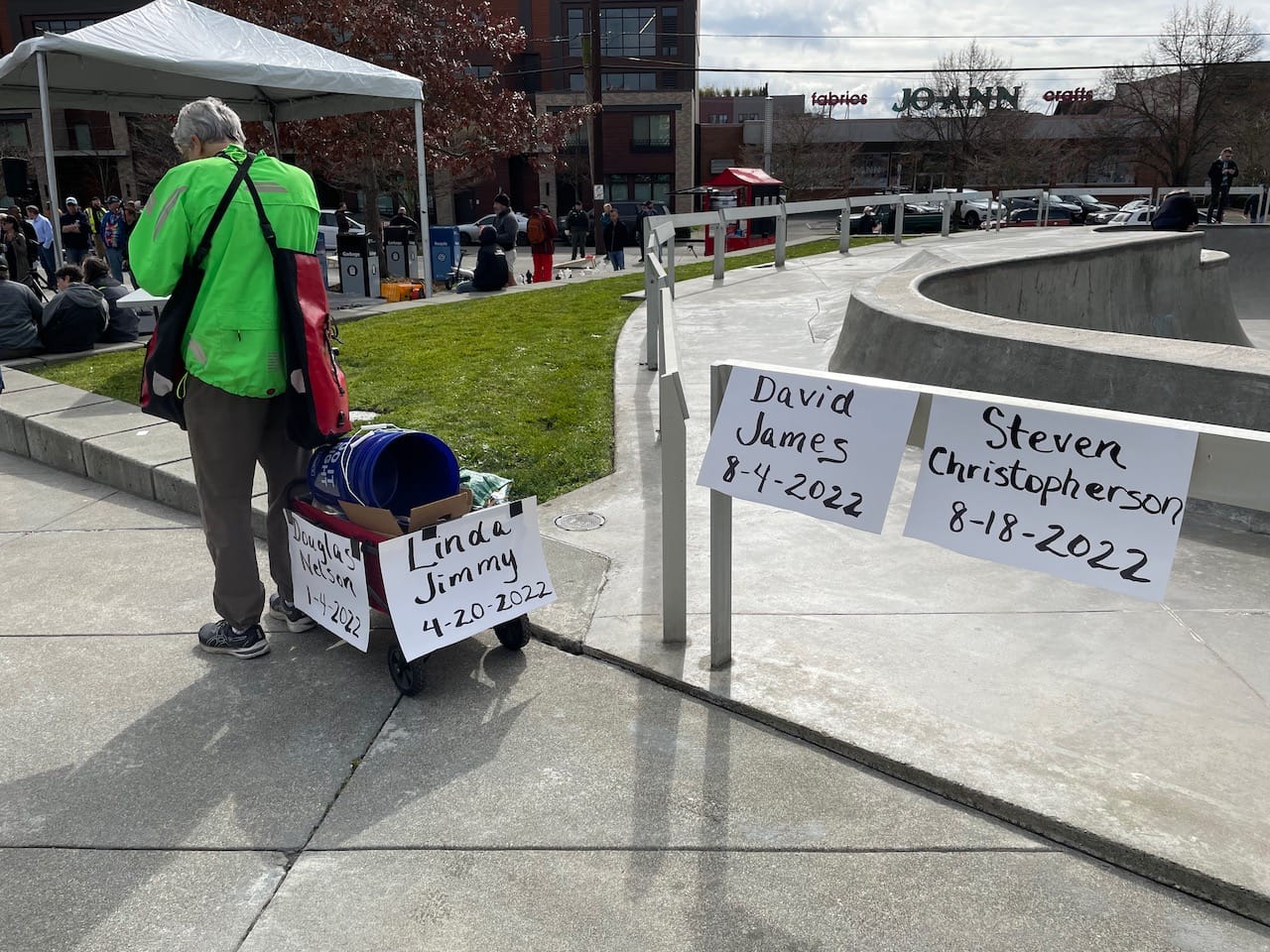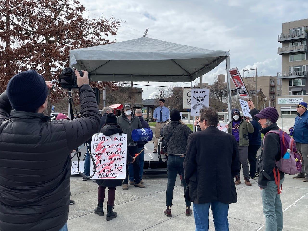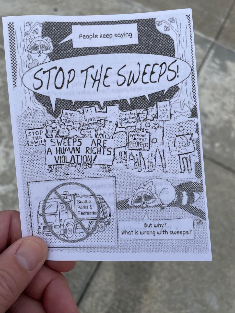As noon rolled around and the scheduled speeches were gearing up, a vocal group from Stop the Sweeps Seattle made sure that those people who were swept and those who remain unhoused in the city were not forgotten.