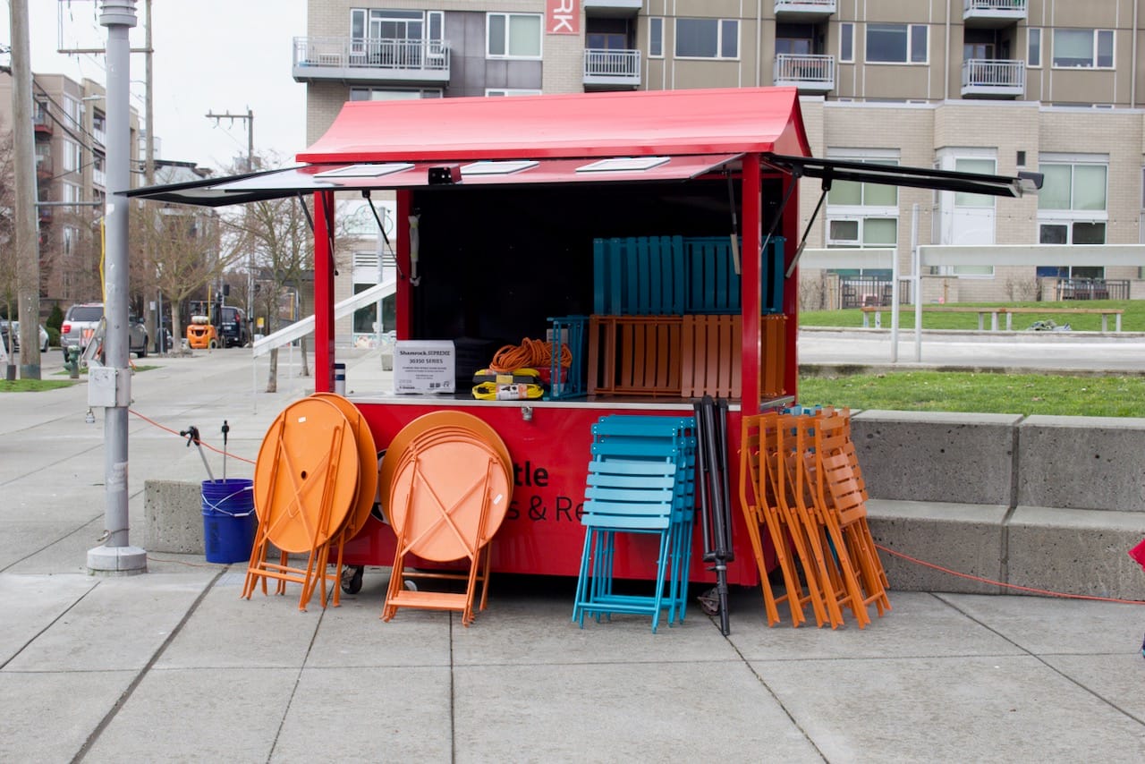 Through the morning, businesses and Seattle Parks and Recreation staff were setting up for the party in a busy din that the Commons had not seen for over a year. Gone were the eight-foot-high chain link fences. Up went the rain canopies and stage. Nearby coffee and ice cream vendors set up for samples. People cut through from northwest to southeast in a route that they had not been able to for at least the era of fences. Likely hadn’t been able for three years as the tent encampment reached a peak and emergency calls to the park a crescendo.