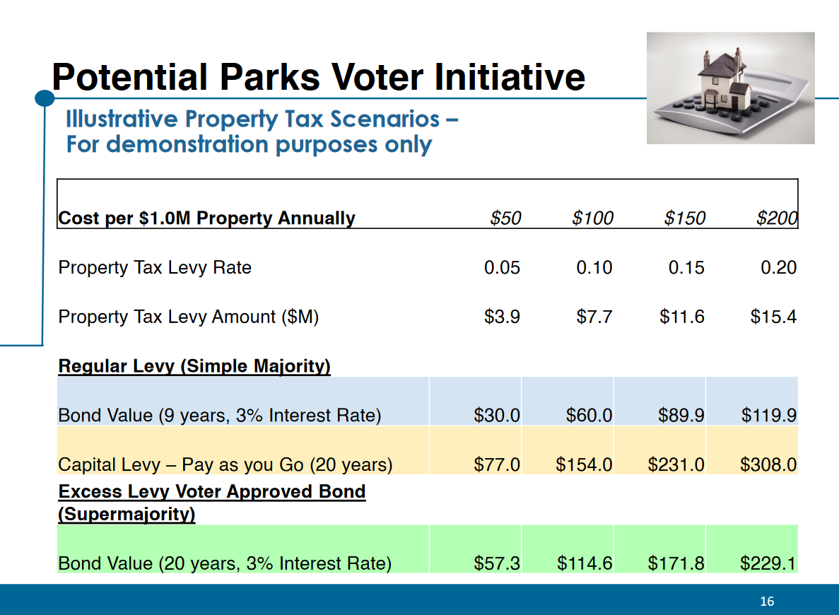 By staff’s estimates, a new 20-year parks levy could provide up to $15.4 million annually ($308 million over the life of the levy) by assessing a 0.02% property tax rate ($200 on an assessed value of $1,000,000). For comparison, Bellevue’s 2008 levy assessed a 0.012% tax ($120 per $1,000,000 in assessed value).
