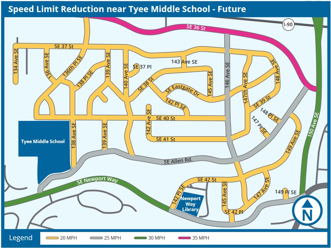 As part of Monday’s consent calendar, City Council unanimously voted to reduce speed limits from 25 to 20 miles per hour on local roads near Tyee Middle School. This Eastgate community became the third Bellevue neighborhood to have its speed limits reduced to 20 miles per hour, joining the Surrey Downs neighborhood and portions of Lake Hills along the East Bellevue Demonstration Greenway. Transportation staff’s report noted that speed limit reductions are both in line with best practices from the National Association of City Transportation Officials (NACTO) and have been well-received by Bellevue residents. Traffic studies show that the risk of death for pedestrians involved in auto collisions increases exponentially as vehicle speed increases. Lowering vehicle speeds by implementing reduced speed limits is therefore one way that city officials seek to reduce traffic-related deaths.