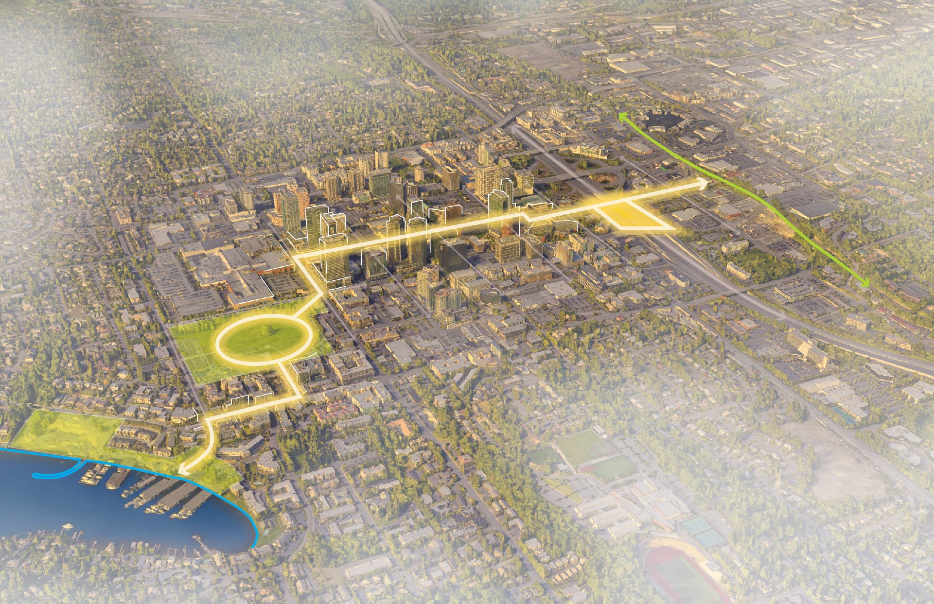 The City of Bellevue is standing up a new City office that will be directly focused on delivering the vision for an activated pedestrian corridor between Lake Washington and the burgeoning Wilburton district. The “Grand Connection” concept has been in the works for over a decade, but it was kicked into higher gear in 2023 as the city advanced plans for a new bicycle and pedestrian bridge over I-405. The Grand Connection Crossing is one of the biggest capital projects that the City of Bellevue has ever undertaken.