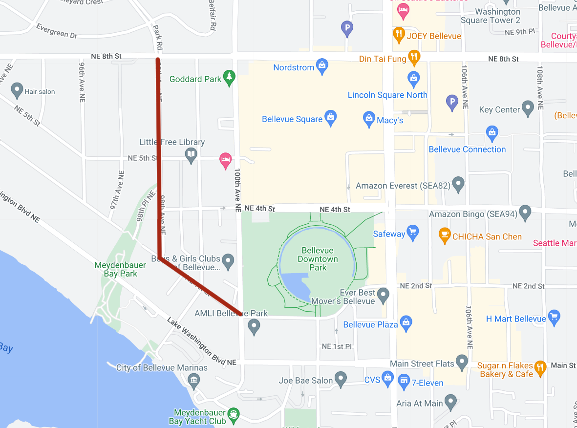 “After conversations with our Security Director and traffic team, City staff, and engaged residents, we shared serious safety concerns about routing bicyclists along Bellevue Square’s driveways on 100th, where over 1.6 million vehicles enter and exit each year,” Frost wrote. “Rather than advocating for the no-build option on 100th, we felt it was important to consider and pay for engineering analysis of adjacent streets that may help provide a safer connection for bicyclists. Staff indicated 98th would be a better option than 99th, as they have planned crosswalk enhancements at 98th to facilitate safe crossings across NE 8th, so that is what we chose to analyze and study for feasibility.”