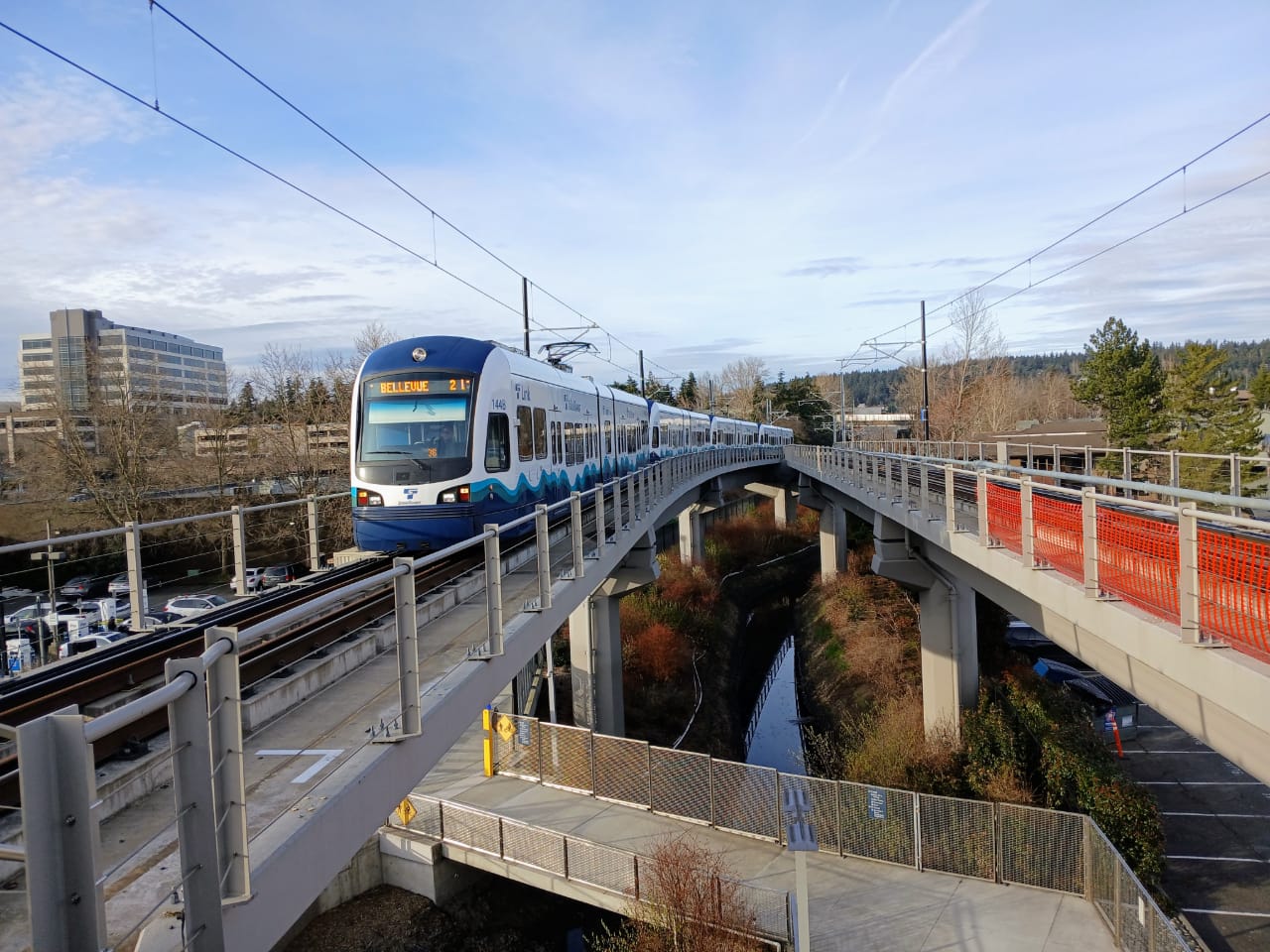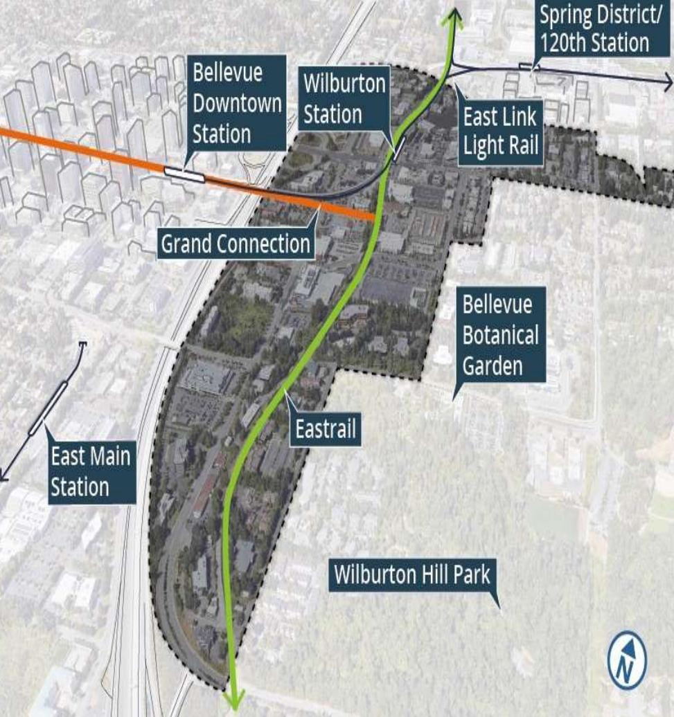 The contrast between Downtown Bellevue Station and Wilburton, the next light rail stop east on Sound Transit’s 2 Line, is stark. Downtown skyscrapers and pedestrian plazas transition to car dealerships and surface parking lots, with the neighborhood bisected by seven-lane, car-dominated NE 8th Street. But the City of Bellevue has grand ambitions for the area, seeing Wilburton’s potential to burgeon into a multimodal hub as the convergence of light rail and the robust and growing Eastrail regional walking and biking corridor.