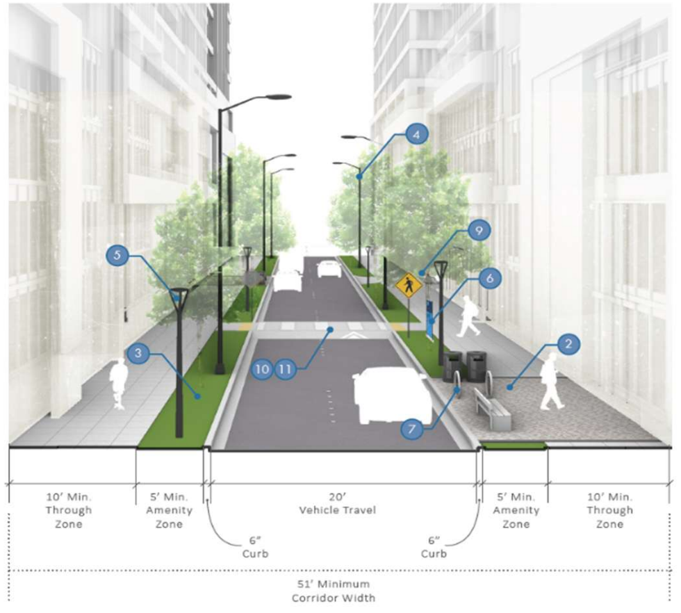 The code also includes requirements for any optional internal street connections beyond those included on the map. More midblock connections would provide big gains for mobility, but making the requirements too onerous could discourage their creation. In the end, the recommendation includes eight foot sidewalks, a reduction from the originally proposed ten, with no on-street parking.