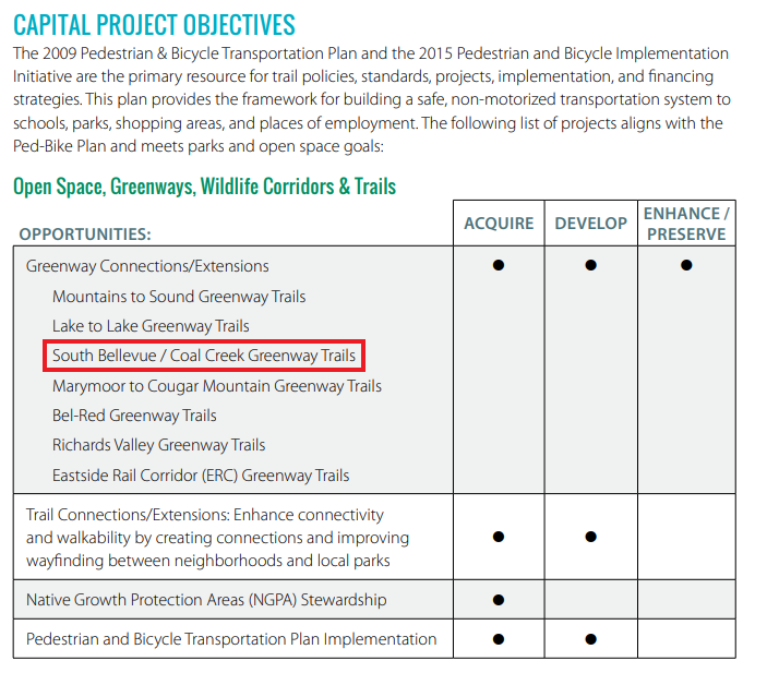 One path to acquiring the parcels would be Bellevue purchasing them with revenues from the current or next parks levy, Capital Improvement Program Plan, and real estate excise tax — all mechanisms that Bellevue currently uses to acquire parkland. Another option is King County’s Conservation Futures Levy that, as of 2016, over $15 million has already been used for Bellevue’s parkland acquisitions. Other programs with King County are also available, Bellevue would just have to apply for funding. This all said, it’s important to caveat that it might be difficult to get funding for Coal Creek because of how well served Cougar Mountain and Lakemont are by parks. The two subareas are among the best served in Bellevue.