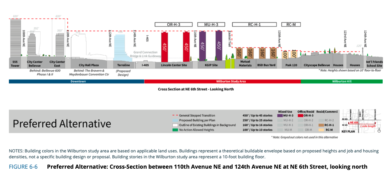 Beyond Wilburton, the preferred growth strategy would also allow more highrises near the Spring District, BelRed, and Wilburton stations serving the BelRed and medical districts with wedding cake zoning stepping down from around 25 stories to 16 stories and then to midrise and lowrise heights.
