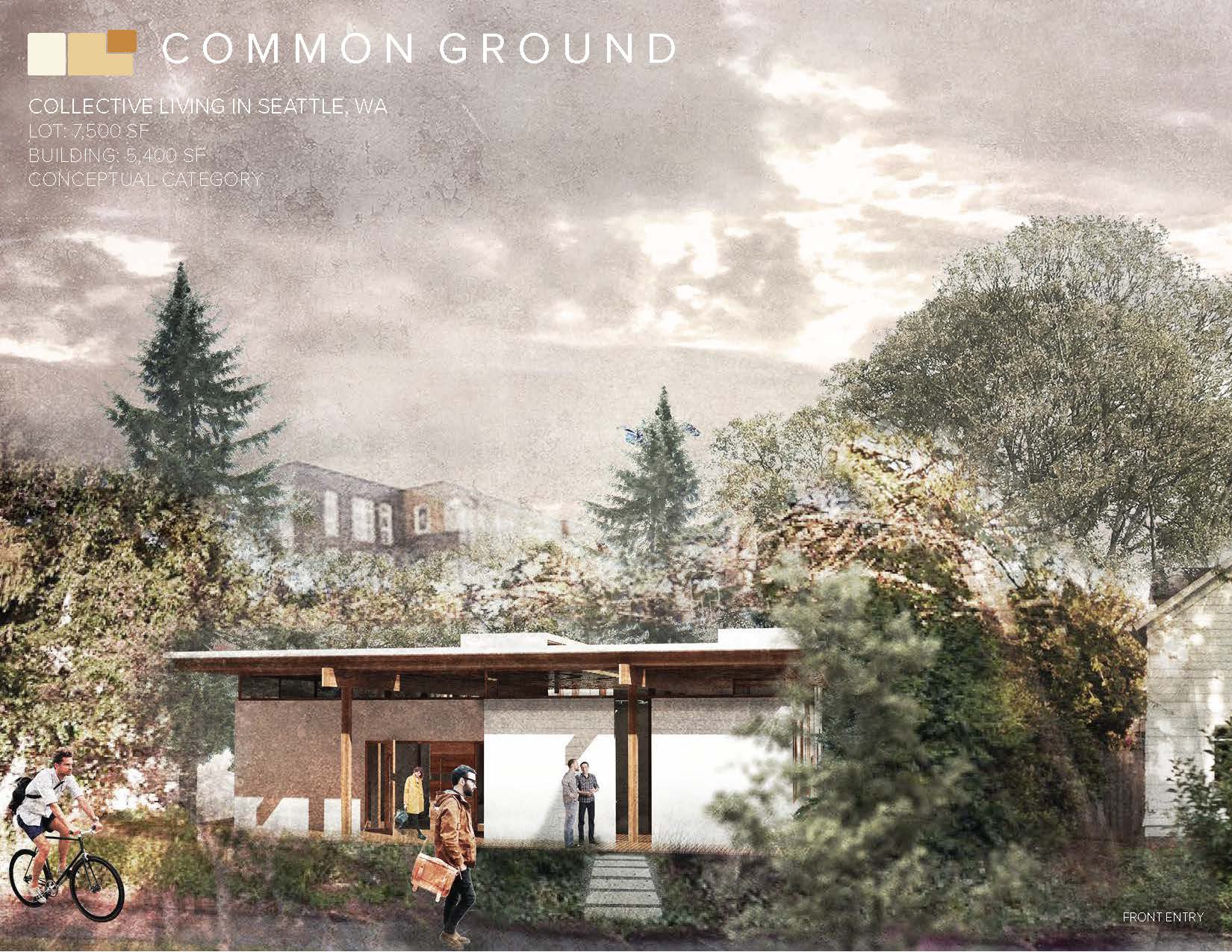 Conceptual architecture can be used to explore ideas that the government is not ready to allow and the market is not yet ready to finance. Common Ground is a conceptual project designed as part of a housing competition by a team of University of Washington Graduate students. The project explores the blurring of the line between live and work, private and common, single and multi-family as it imagines a new form of living that can be fit into a traditional single-family neighborhood.