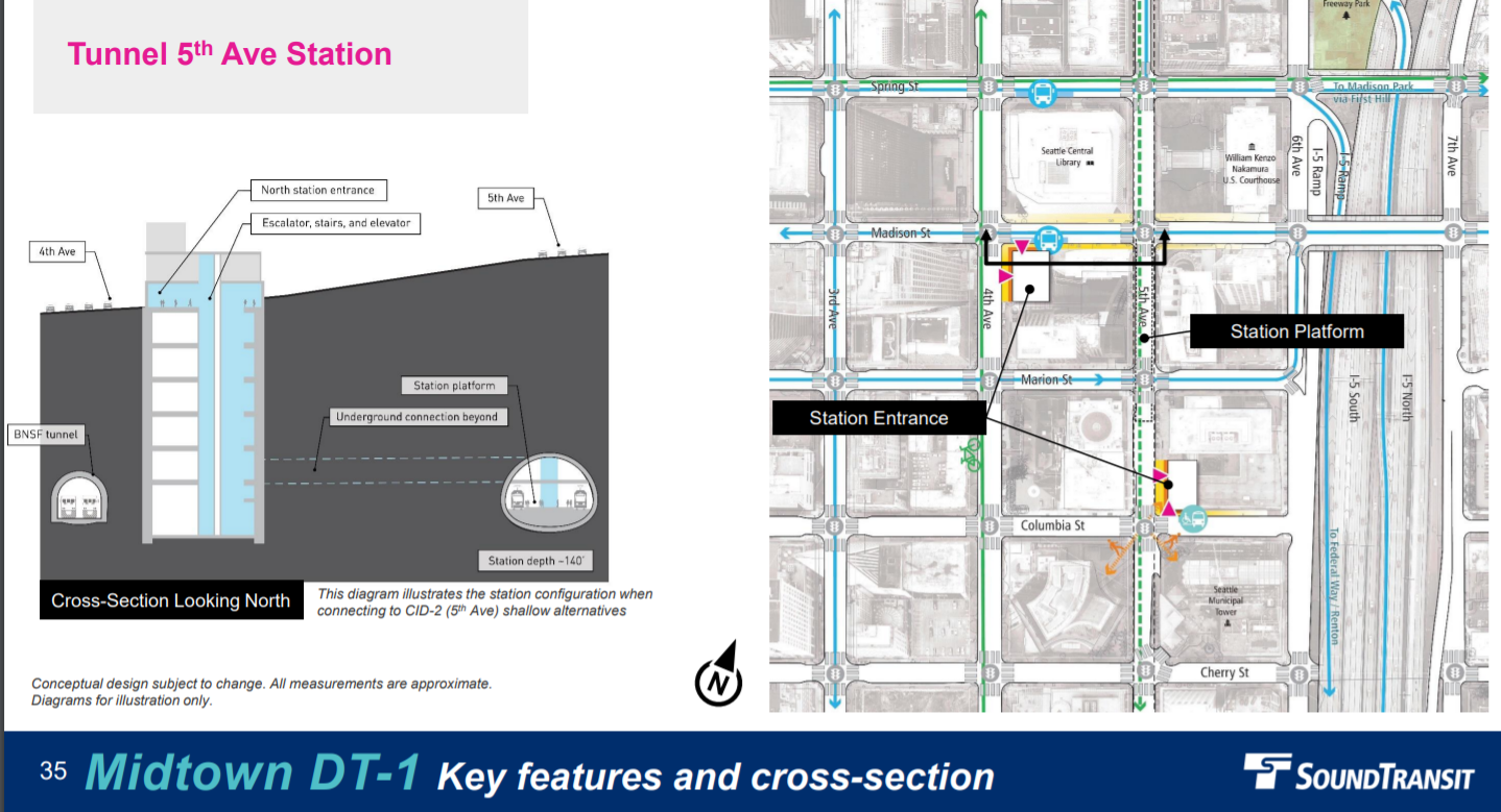 As it stands, Midtown Station is about 140 feet deep in the agency’s preferred alternative. The initial plan also calls for a fairly long walk on a mezzanine level to reach the elevators to the surface either at the north entrance (opposite Seattle Central Library) or the south entrance, which is envisioned at 5th and Columbia Street. The 5th Avenue Station is still the superior option of the two presented, but making the station shallower should improve access.