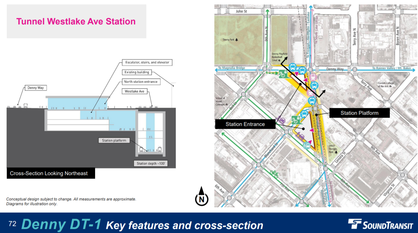 Both Denny Station alternatives are pretty solid, but The Urbanist gives a slight edge to the Westlake option. The preferred alternative Denny is shallower (100 feet versus 125 feet) and offers more seamless transit connections. The catch is that putting the station underneath Westlake Avenue would disrupt streetcar and bus operations on the street above during construction. “For Preferred Alternative DT-1, other segments of the streetcar may continue to operate, but not as a connected system, which could impact the frequency of service,” the DEIS noted.