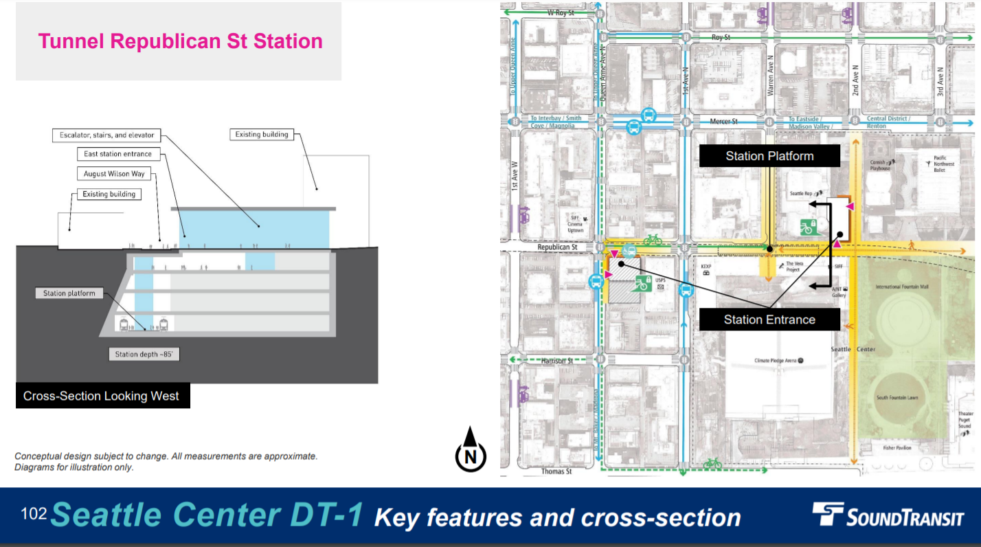 From a rider perspective, the Republican Street station is clearly superior. Estimated to be 85 feet deep, the station also boasts elevators headed direct to the surface, forgoing the elaborate mezzanine interchanges that may confound and delay riders elsewhere downtown. Mercer is significantly deeper at about 110 feet deep, wouldn’t have elevators direct to the surface as currently planned, and it’s also farther from Climate Pledge Arena and the rest of the Seattle Center complex. Simply put, it’s just far less convenient.