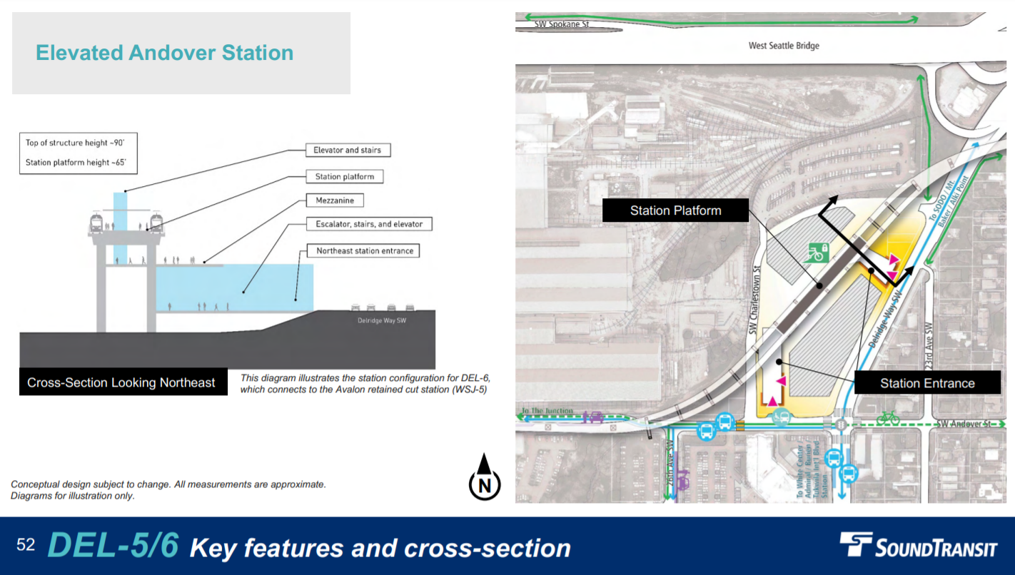 The Elevated Andover Station Lower Height Alternative (DEL-6) came among the most affordable Delridge stations and it is the only one that pairs with the retained cut station in Avalon. Delridge will primarily be a bus transfer station since it’s located in an industrial area sandwiched against the West Seattle Freeway. RapidRide H, set to open later this year and upgrade Route 120, will run down Delridge Way SW and ferry many riders to their ultimate destination. Putting the station so far north and close to the freeway isn’t ideal, and we encourage Sound Transit to look at options to open up a better walkshed and more TOD opportunities while still pairing with the retained cut Avalon Station. Still, since bus transfers will be the primary source of riders, the location could be workable.