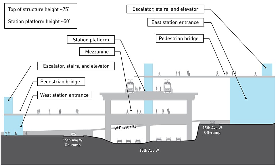 As with Junction, Ballard has a tunnel station that is surprisingly cost competitive with the elevated options in the Draft EIS. The 14th Avenue Tunnel Station is among the cheapest alternatives, and unlike the preferred alternative, it doesn’t include a moveable bridge crossing of Salmon Bay, which would come with reliability issues. On the other hand, 14th Avenue is farther from the historic core of Ballard, and the busy 15th Avenue NW is a significant impediment to people walking, rolling, or biking to the station and can slow Route 44 buses as well.