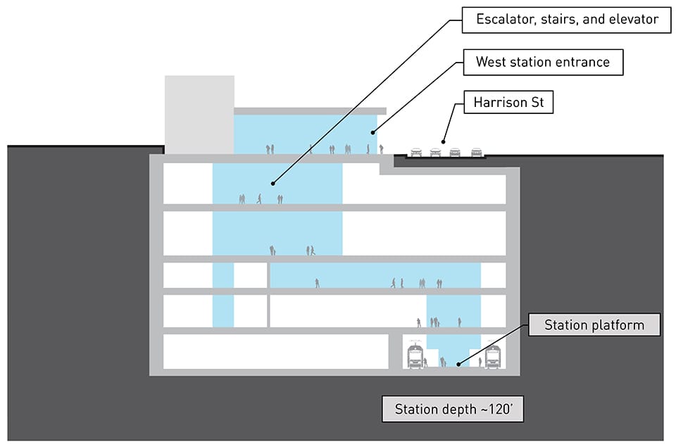Seattle Subway’s super shallow concept comes with some engineering challenges, but they’re asking Sound Transit to study the idea and confirm its feasibility. Siting the station so close to the surface would require the new tunnel to cross over the existing transit tunnel rather than underneath it as it heads toward Midtown Station, which could be a tight squeeze. But Seattle Subway believes it could be possible, and doing so may also allow a shallower Midtown Station — a win-win.