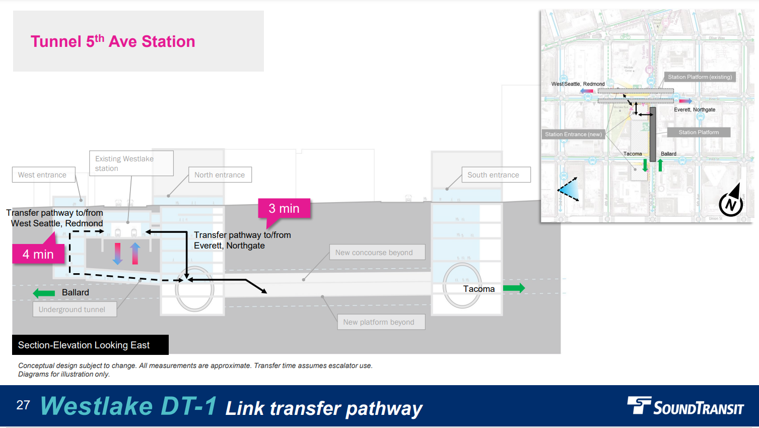 Sound Transit estimates the time to surface at four to six minutes via escalator for the new Westlake Station, and the elevator time would be three to five minutes. The transfer to the existing station nearly 100 feet up, meanwhile, will take three minutes to the closer northbound side and four minutes to the far southbound side of the platform. Again these times are for able-bodied riders, as the agency has yet to dig into how the station designs will affect disabled riders. If the agency is able to decrease the distance and travel time between the two stations, it certainly should.