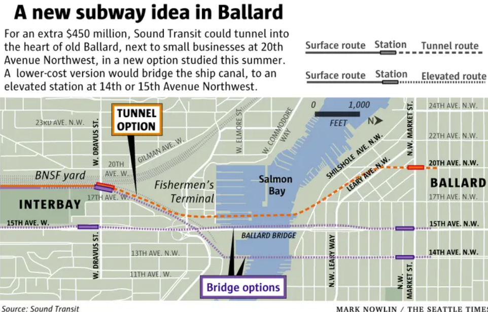 Ballard Link will follow and is slated to open in 2037 — or perhaps later depending on cost and engineering challenges. The big questions include where to site the Chinatown-International District station, which affects how deep the neighboring Midtown Station will be and the quality of the transfer to the other lines. The Salmon Bay crossing also looms large, with either a tunnel or fixed high bridge the most reasonable alternatives. This ties in with the debate centering on if 14th Avenue is too far away from the historic heart of Ballard. Seattle Subway is advocating for the late insertion of a 20th Avenue Tunnel Station back into contention and further study.