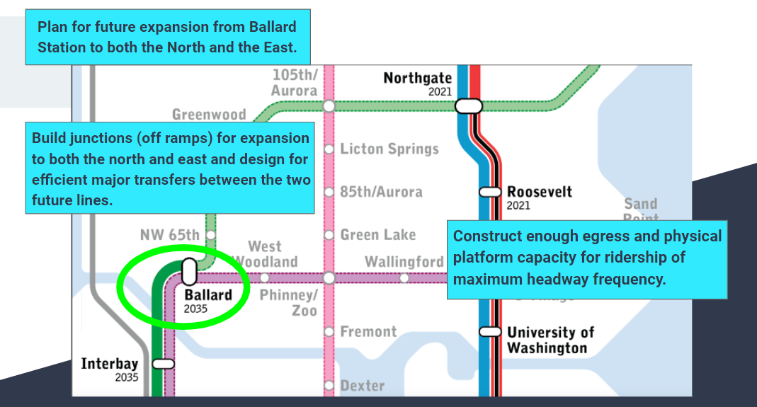 - Design the system to be easy to expand. Ideally, West Seattle Junction will not be the southern terminus long as the line extends south to White Center and Burien. Likewise, Ballard should not be the northern terminus long as the line extends north to Greenwood and perhaps east to Wallingford and the University District. Meanwhile, a future Aurora rail line may link up with the new Downtown light rail tunnel near South Lake Union Station. Planning with expandability in mind could save billions of dollars and numerous headaches down the road.