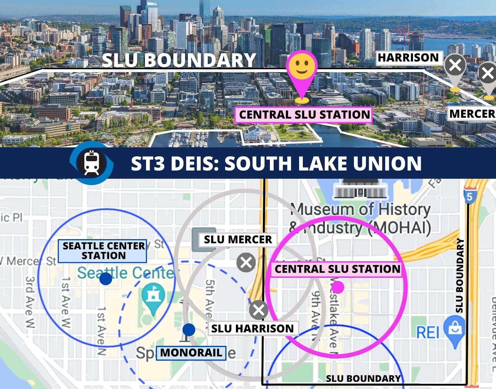 Recommended feedback: Prefer Harrison Street as the less bad option included, but study a Westlake Avenue or similar alignment centered in South Lake Union as much as possible.