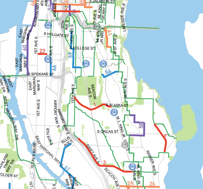 - Major north-south routes in Southeast Seattle: Safe facilities on Rainier Avenue, Beacon Ave, 15th Ave S, and 12th Ave S all the way to Yesler Way are specifically mentioned.