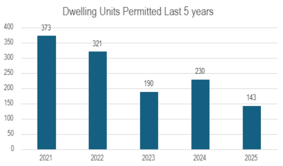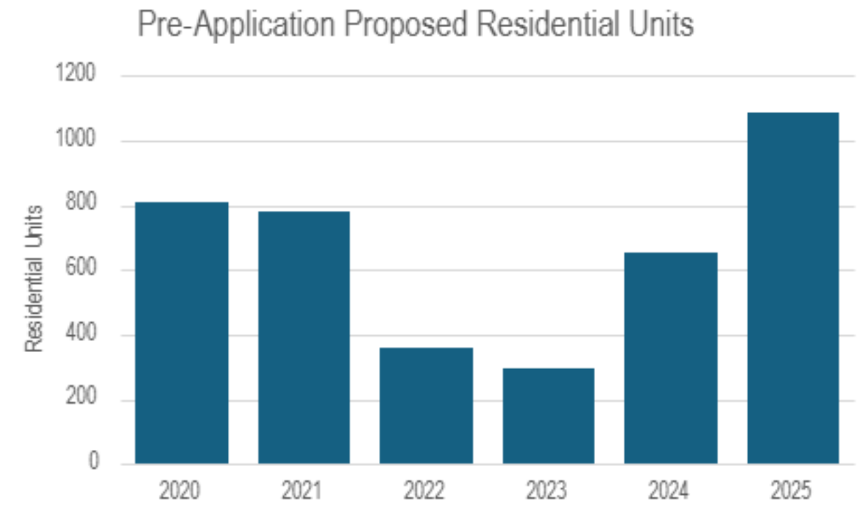 The leading indicator in Bothell is projects entering the pre-application stage, an advisory level where City staff work with property owners and developers to determine how best to advance a development forward. Last fall, Bothell’s Development Services Department started to get a sense that pre-applications were really taking off, a fact that was borne out in the final numbers for 2025. Where the city had seen pre-applications for just over 600 units submitted in 2024, and had averaged 580 over the previous five years, that number shot up to more than 1,000 last year.