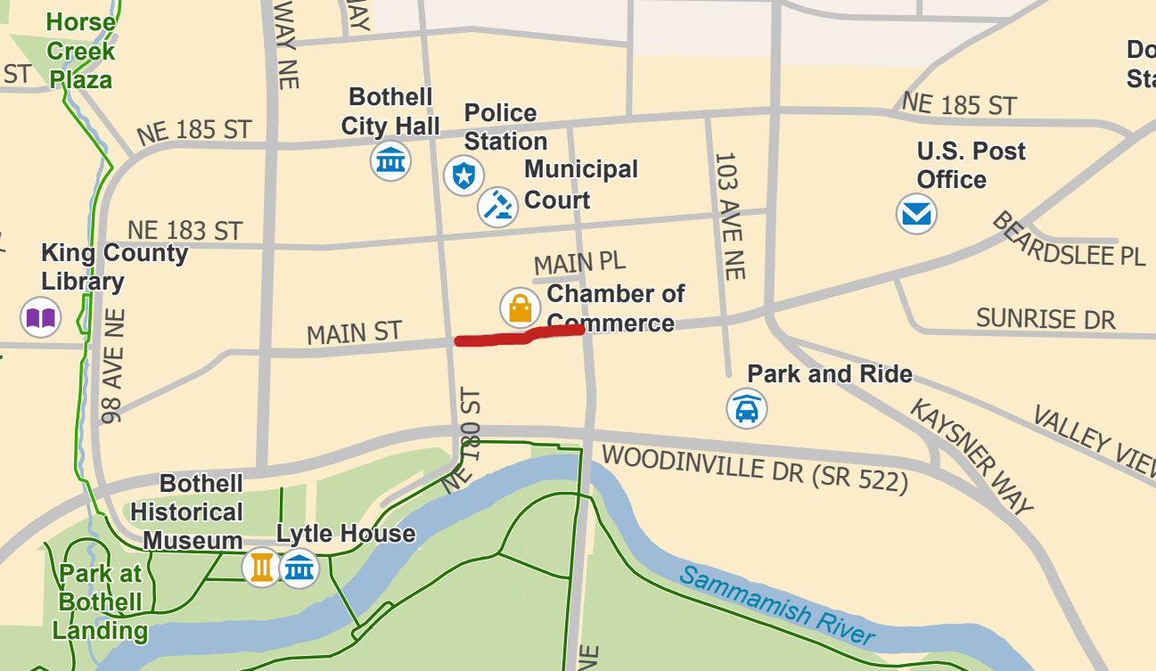Buses heading through Bothell are using NE 185th Street two blocks north, which is the designated transit corridor that Sound Transit’s Stride bus rapid transit service will use through Bothell. Steve Morikawa, Capital Division Manager at Bothell Public Works, told the council that Sound Transit and Metro had previously requested that street be converted to a transit-only street but that Bothell had turned that idea down due to potential traffic impacts. There is no transit lane at all on the street, but one could be accommodated in the future by removing the on-street parking on the corridor.