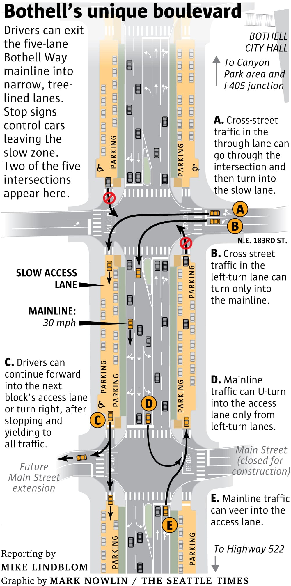 By creating an entirely new concept, Bothell is also asking motorists to learn many rules that won’t necessarily come naturally. At low speeds, these awkward turning movements could allow for mistakes, but add speed and collisions will surely occur. Watch the video below (from the City of Bothell’s project website) to see all the conflict points a multiway boulevard creates.