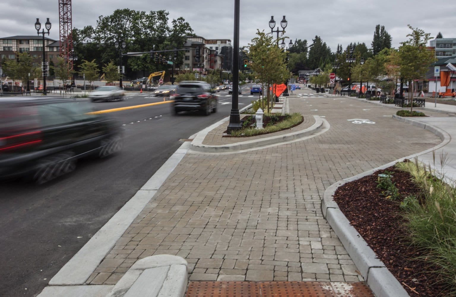 The design has some positives beyond mere beautification: 14-foot sidewalks, 10-foot travel lanes in the parking zones, and the pervious surfaces and rain gardens should decrease stormwater runoff. It’s admirable that Bothell is thinking big and planning for the downtown it wants to have in the future. Taking down the SR-527 signs helps delineate that Bothell doesn’t want the road to feel like a highway through its booming downtown. If motorists obey all the proper multiway movements and bicyclists get a separated facility, the Bothell Way NE boulevard could be quite successful. Some placemaking along the edges of the boulevard would also help draw in pedestrians. Bothell tried for the grand Parisian boulevard approach, but in this acrobatic manuever for a carcentric suburb, it didn’t nail the landing.