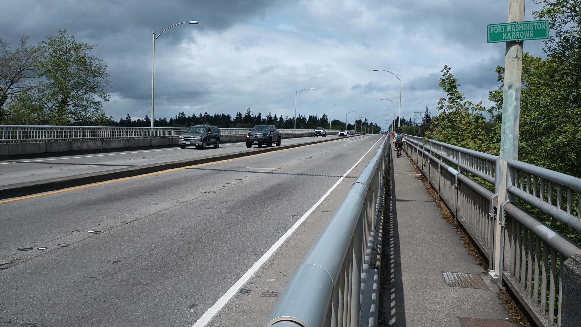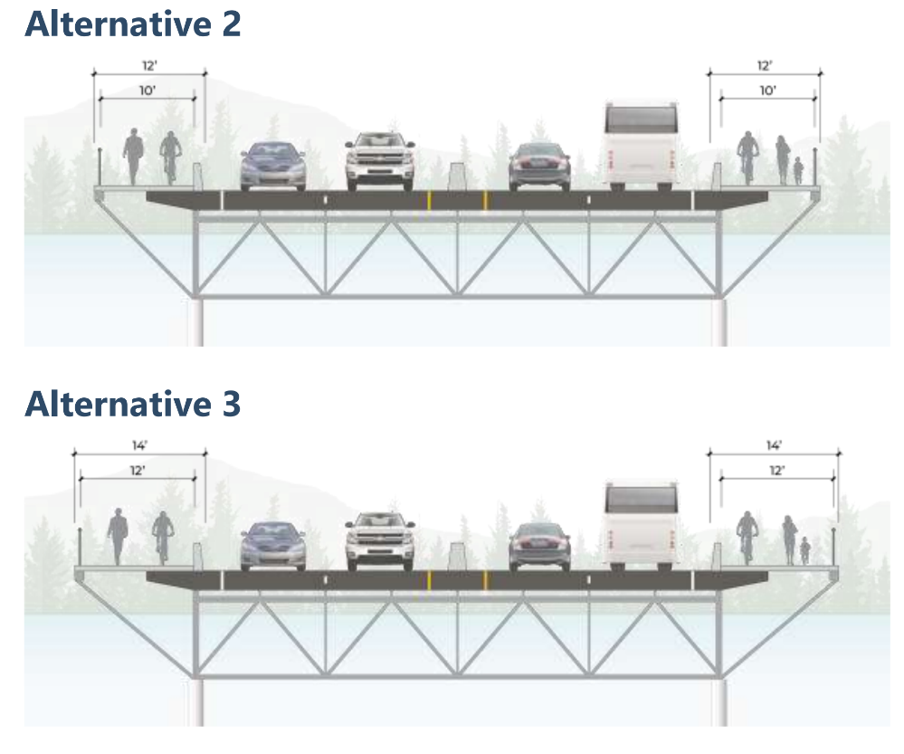 Despite the calls from bike advocates like members of the West Sound Cycling Club for a wider east side path, the options that ended up advanced to the Bremerton city council didn’t include that option. Instead, they were presented with an option for two ten-foot paths, which fits the project budget at $25.6 million, or two twelve-foot paths, which exceeds it at $29.1 million. But it was Council President Coughlin who had to be the one to introduce an alternative that included an eight-foot path on the west side of the bridge, with 12 feet on the other: an option within the project budget that would provide the most space for people of all modes to mix.