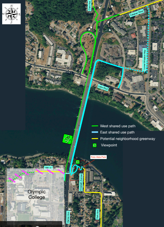 Through the process to whittle down alternatives for the bridge, run by staff in Bremerton Mayor Greg Wheeler’s administration, a key point of contention was whether the city should move forward with a bridge design that includes paths with differing widths on the east and west sides of the bridge. The east side of the bridge is expected to be much more highly trafficked, especially by people on bikes. That side of the bridge makes the most sense to tie into the rest of the city’s bike network, with underutilized Rota Vista Park on the bridge’s south end an obvious place for a tie-in between the bridge and the city’s street grid.