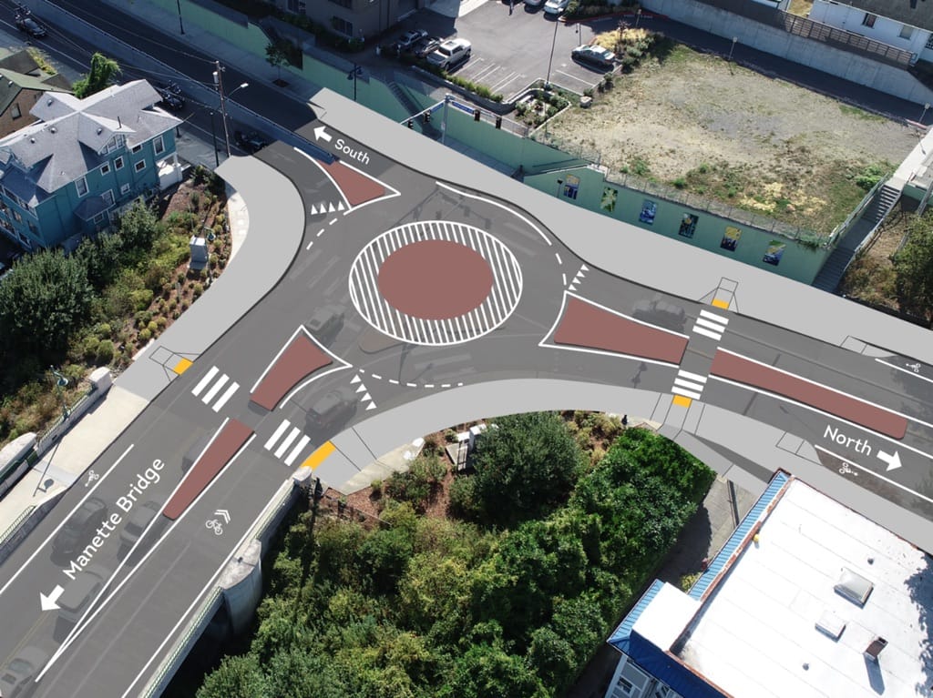 Bremerton’s new roundabout on Washington Avenue at Manette Bridge could have been a shining gem for the City. Just a five-minute walk from the ferry terminal and leading to the hip Manette neighborhood, the project should have been inviting for tourists and locals to stroll the amazing views off the Manette Bridge. Instead, the City overbuilt the road for cars and crammed cyclists and pedestrians into a narrow eight-foot path.