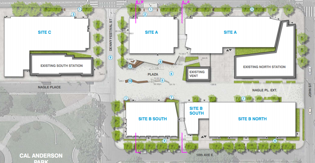 The centerpiece for the project is a central plaza, located on an extension of narrow Nagle Place between Denny Way and John Street, that will function as an extension of Cal Anderson Park and turn the Denny Way festival street into an inviting and active public gathering place.