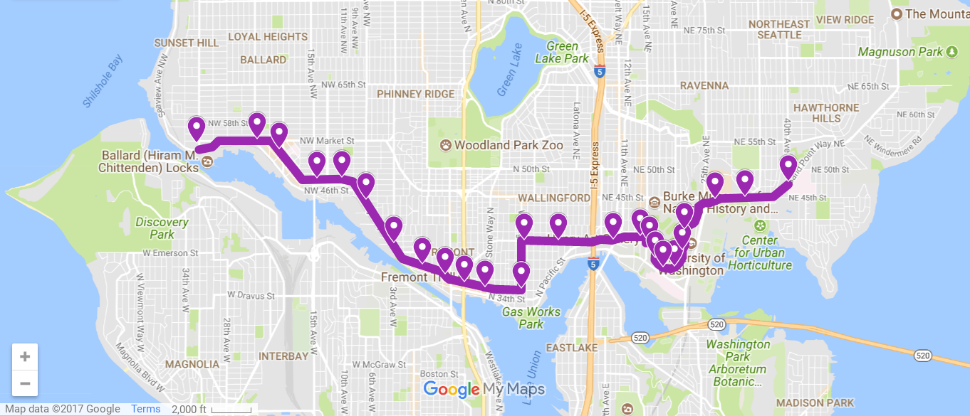 King County Metro Transit’s long-range plan would bring the county’s RapidRide total to 40 by 2040. But something not envisioned is a route connecting Ballard and the University of Washington (UW) on streets closer to the water. The two neighborhoods will have a RapidRide connection when Route 44 is upgraded in 2023. That still leaves Lower Wallingford without a direct connection to Ballard, and southeastern part of Fremont without a direct connection to the UW. That made me wonder if a “Cut Line”–tracking along the northern edge of the Salmon Bay, the Fremont Cut, Lake Union, Portage Bay, Montlake Cut, and Union Bay–would be useful and ridership-inducing.