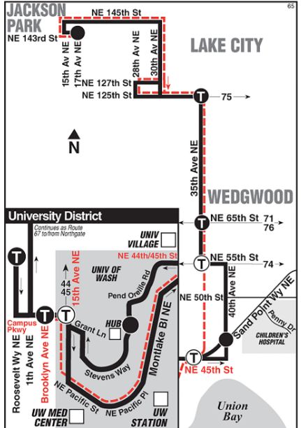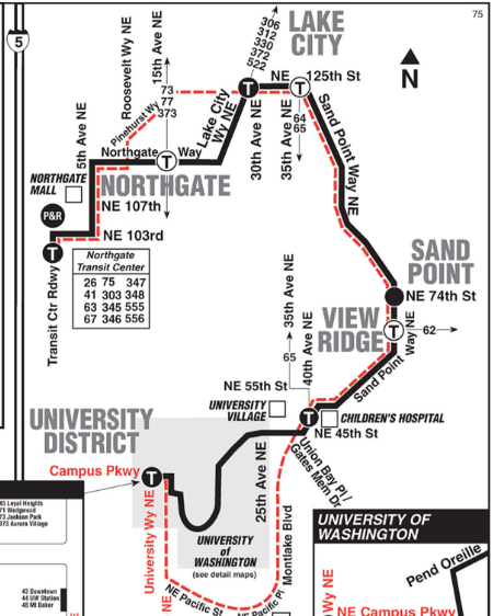 The map shows the route terminating at Seattle Children’s like Route 32 does today. However, often Route 32 turns into the 75 and continues on to Sand Point, Lake City, and finally Northgate–at the site of soon-to-be Link station. The 75 is in the frequent network with 15 minute service or better all day. The even more frequent Route 65, which serves Wedgwood and Lake City, also could be a route pairing. As an urban village, Wedgwood would be a strong enough destination to draw RapidRide service, but Wedgwood is not yet an urban village and has only grandfathered multifamily zoning. That could change, at least if anybody listened to The Urbanist; we endorsed adding it as an urban village back in 2015.