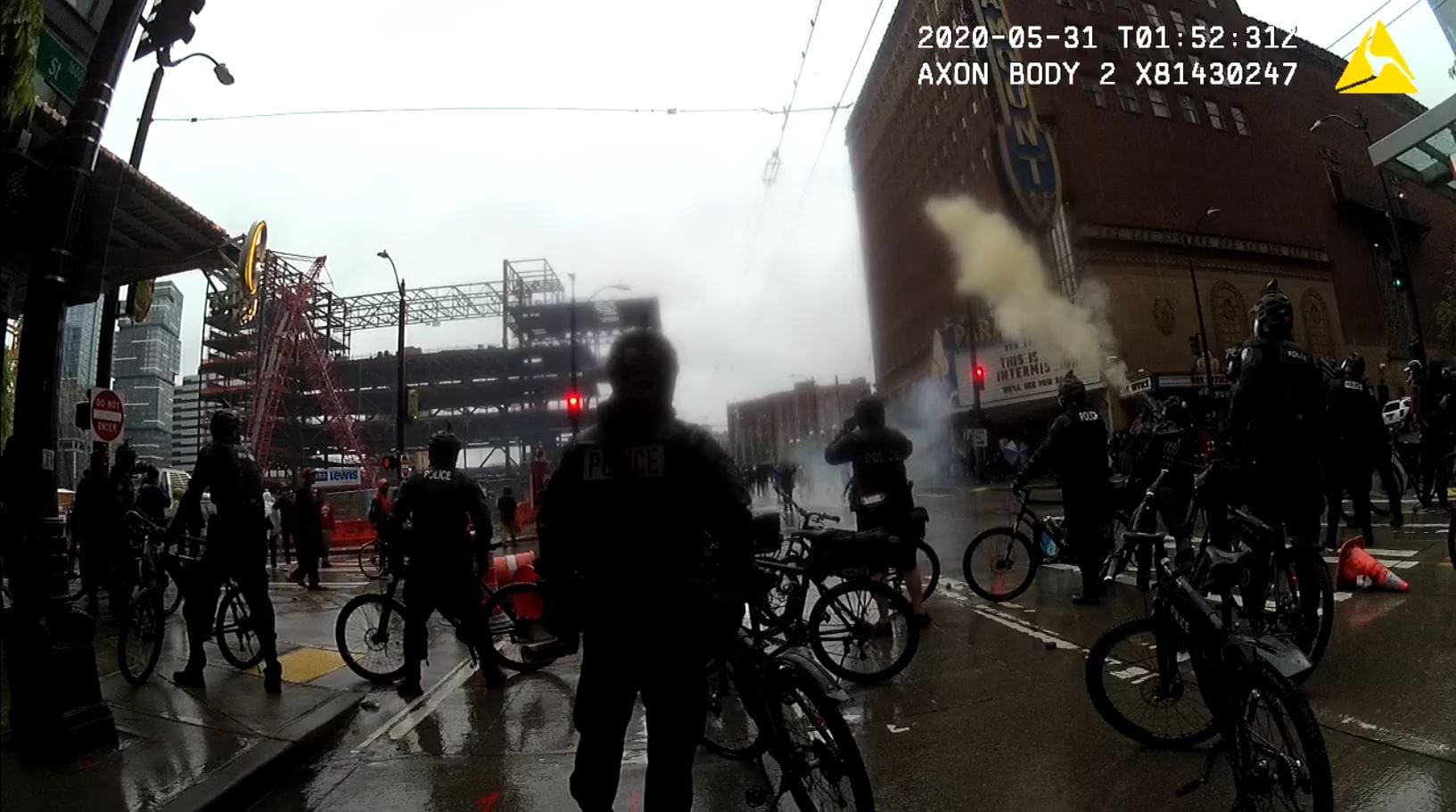 Body-worn video obtained through public records requests show Kent PD officers on the ground asking “What’s the plan?!” as they held hundreds of people back on May 30th, 2020. An SPD bike team sergeant rides up behind the line, and is asked “what’s the plan? Are we just holding for now, or..?” He replies, “I don’t know.”