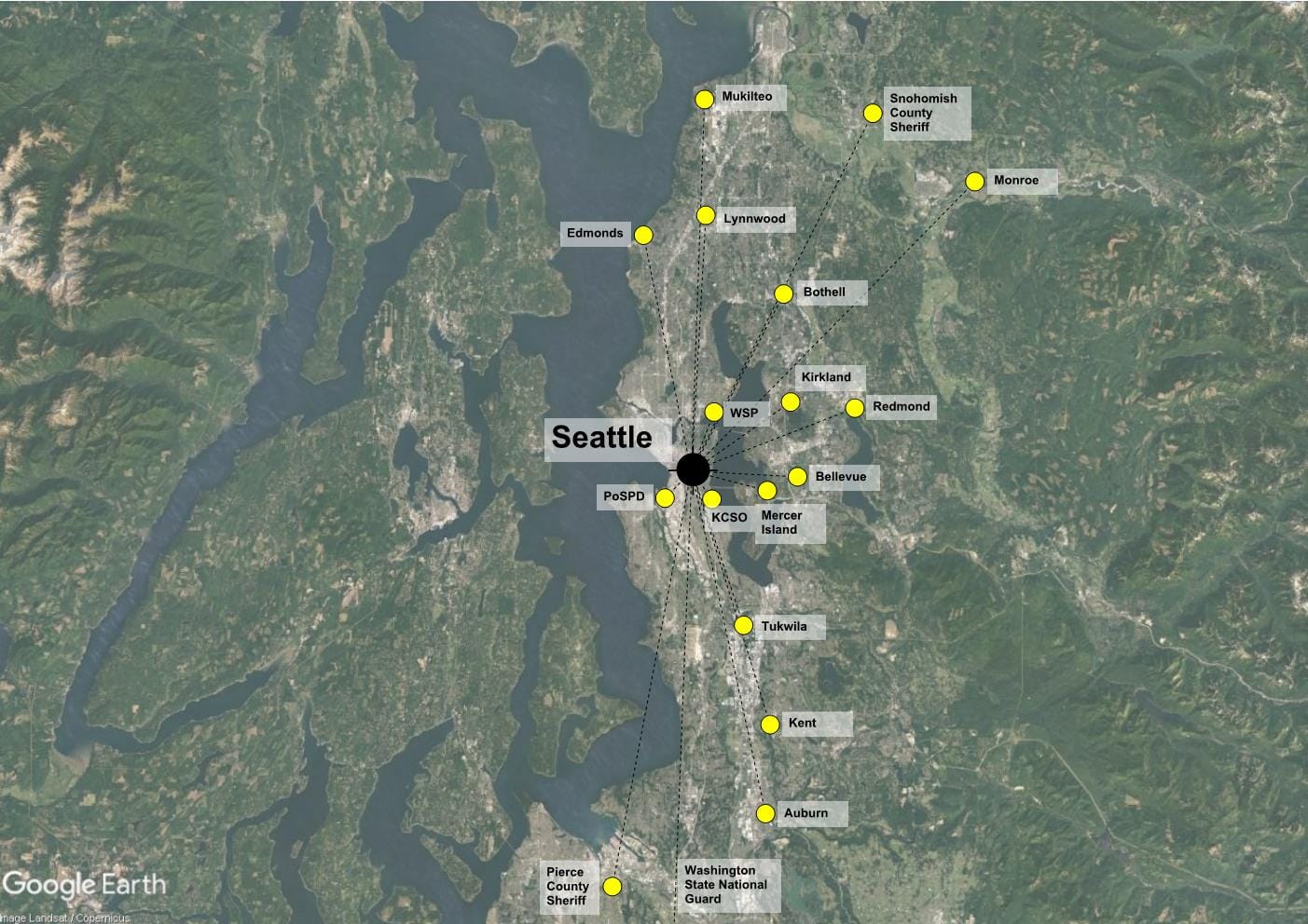 Over the next week, at least 23 different police departments (PDs) or agencies would respond or assist, including personnel from Auburn PD, Bellevue PD, Bothell PD, Edmonds PD, Federal Way PD, Kent PD, King County Sheriff, Kirkland PD, Lynnwood PD, Mercer Island PD, Mill Creek PD, Monroe PD, Mukilteo PD, Mountlake Terrace PD, Pierce County Sheriff, Port of Seattle PD, Redmond PD, Shelton PD, Snohomish County Sheriff, Tukwila PD, the Washington State Department of Corrections, the Washington State National Guard, and the Washington State Patrol (WSP).