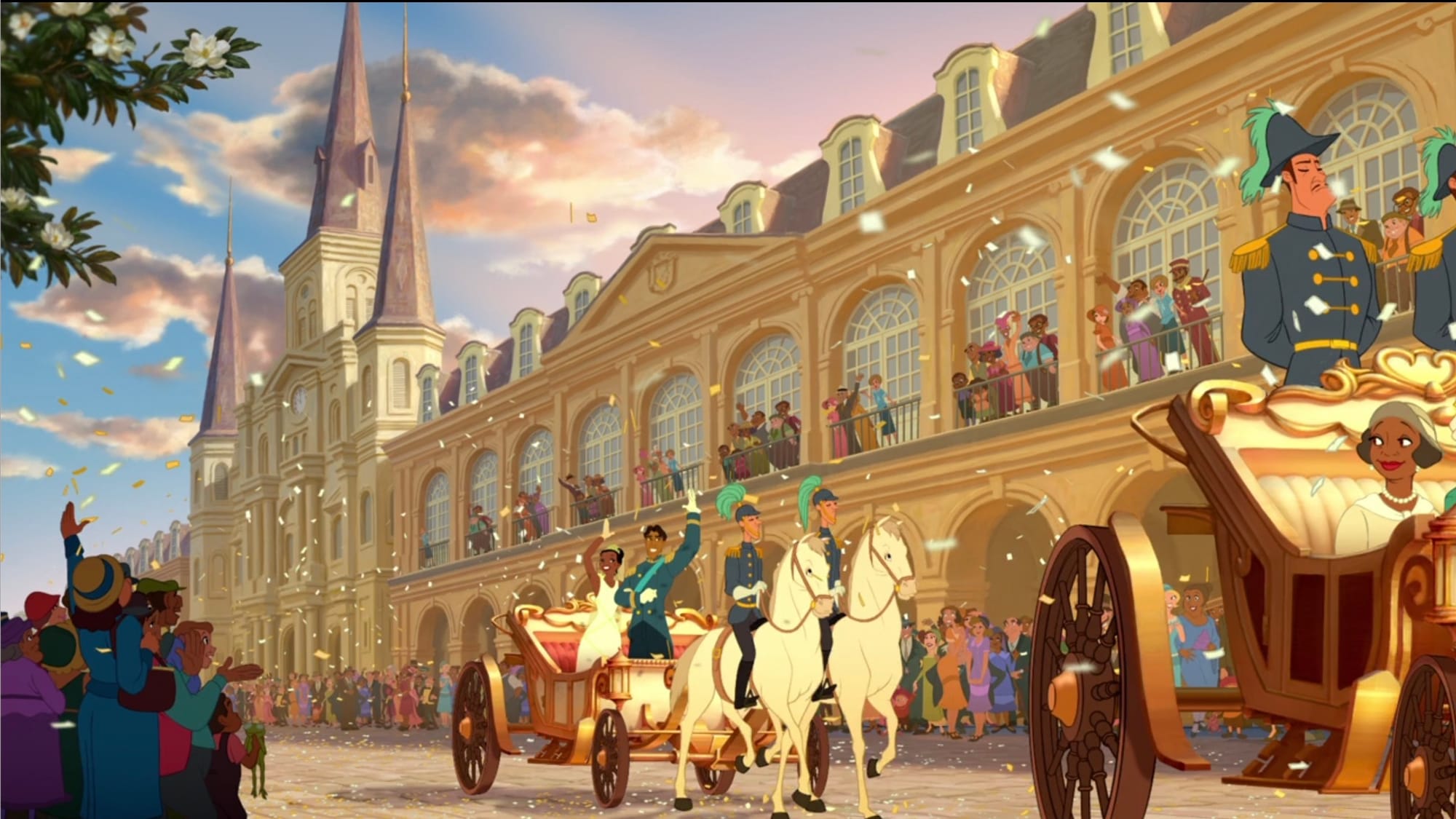 The Princess and The Frog is similarly gilded in New Orleans. The city plays a role as a setting for Tiana’s life and future restaurant, but most of the movie’s action and character development happens out on the bayou. When they return to the city, it’s for Mardi Gras to emphasize the swirl and countdown to midnight. The jazz and the beads are just for show. This is the South, but most of the discussion of segregation is through contrast with Tiana’s rich white friend Charlotte La Bouff. Though the city is deeply Catholic, there’s two preliminary weddings that call into question whether Prince Naveen would even be allowed to marry in St. Louis Cathedral at the end of the film. Also, Louisiana did not permit interracial marriages until 1967.
