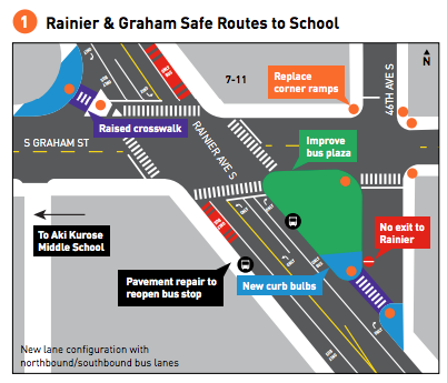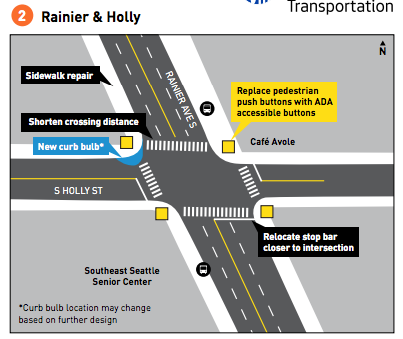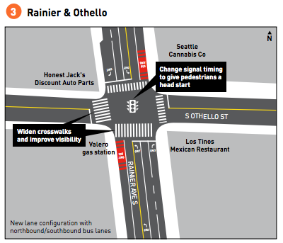 The most robust upgrade will come to Rainier Avenue and S Graham St with curb bulbs and raised crosswalks will improve crossings where the streets intersect at odd angles. For most other intersections, the improvements are less dramatic. For example, at S Othello St, the only change will be the addition of a leading pedestrian interval to give people walking a head start before people driving, as well as widened crosswalks.