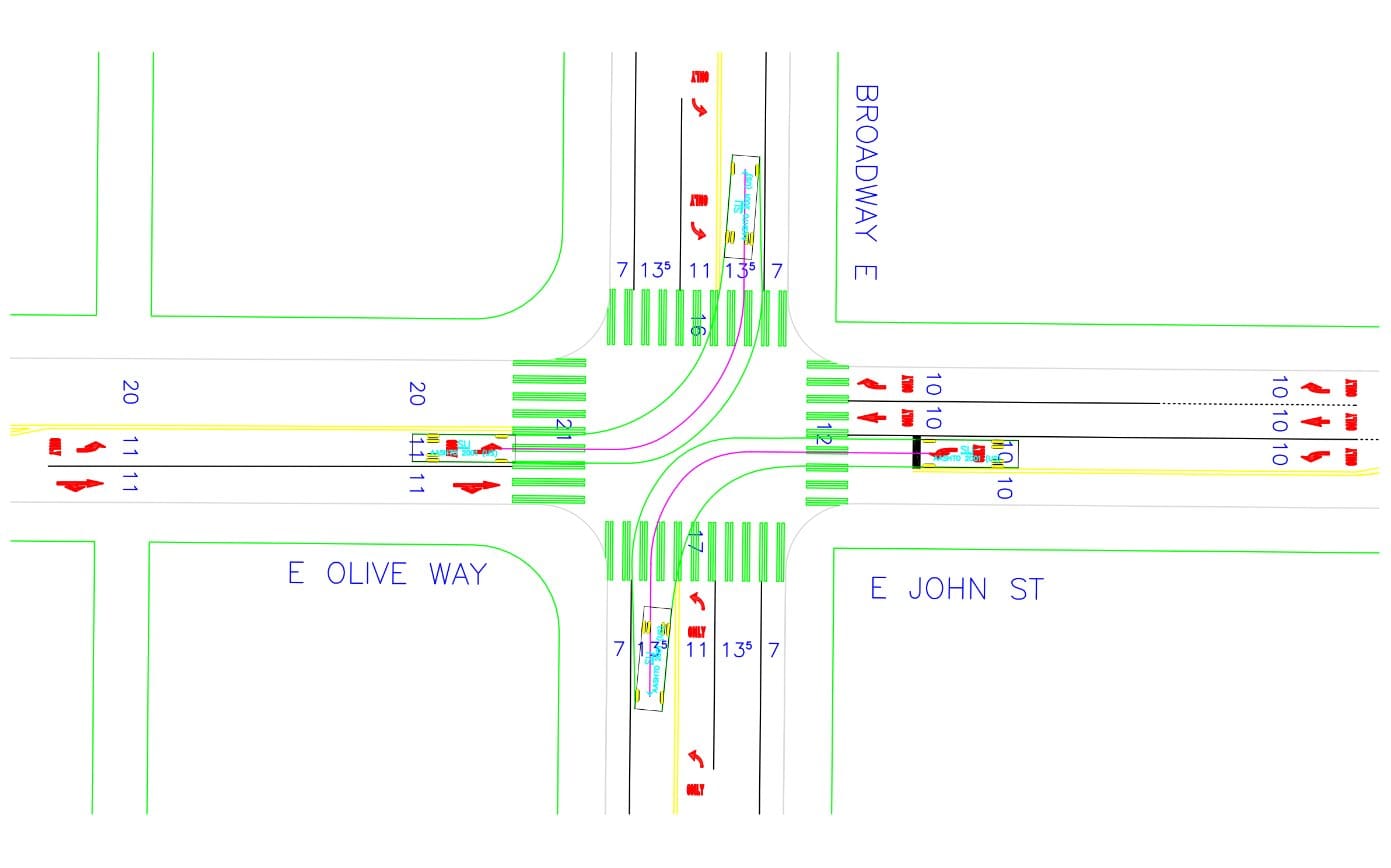 The place where the most vehicle traffic comes into contact with people using Broadway on foot is the corner of Broadway E and E Olive Way. Around 16,000 cars per day use E Olive Way, with around equal numbers using Broadway E north of the intersection. Unlike lower traffic intersections like Broadway and Pine, there are no left turn signals in any of the four directions, so drivers turning must choose when to make their turns around pedestrian traffic.
