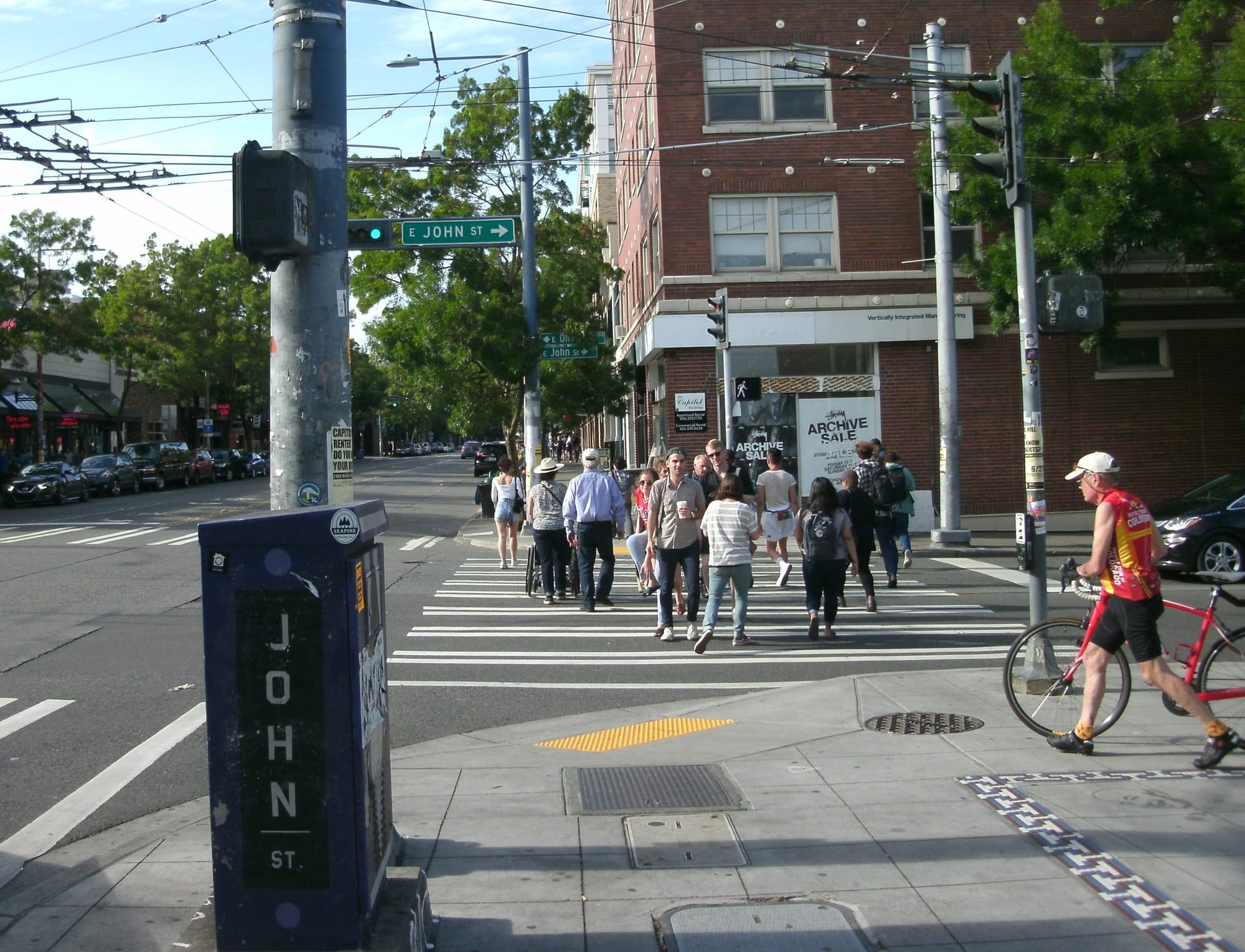 Now the department is scaling back plans for the signal replacement needed to add left turn arrows, saying that adding them would be cost prohibitive. Instead they propose simply rechannelizing the lanes on the roadway, which are poorly defined currently. According to the department, turn pockets for east-west travel will treat the dominant collision pattern at the intersection: there were 14 collisions involving left turning vehicles over a three-year study period. The only problem is that the lane lines will not dramatically change how the intersection operates now. Vehicle traffic already separates into de facto turn lanes and through lanes, with drivers from the east and the west frequently chosing to turn in between groups of crossing pedestrians, a move that is actually illegal under Washington law (drivers are required to leave one lane width between their vehicle and a crossing pedestrian).