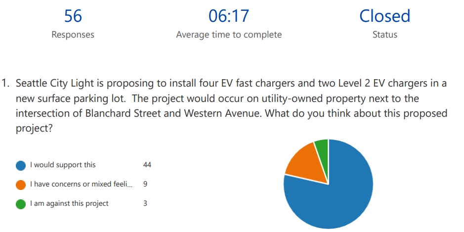 For the site in Belltown, which would be at the corner of Blanchard Street and Western Avenue adjacent to the brand new four-lane Elliott Way, City Light conducted a community survey earlier this year to solicit public opinion. With that survey now closed, The Urbanist submitted a public records request to find out what the results were. Only 56 people completed the survey City Light circulated. 44 of those 56 people said they supported the idea of an EV lot at this location, but 56 people is fewer than the total number of people who even live in just one residential building opposite the project: 2134 Western Ave alone has 145 residences.