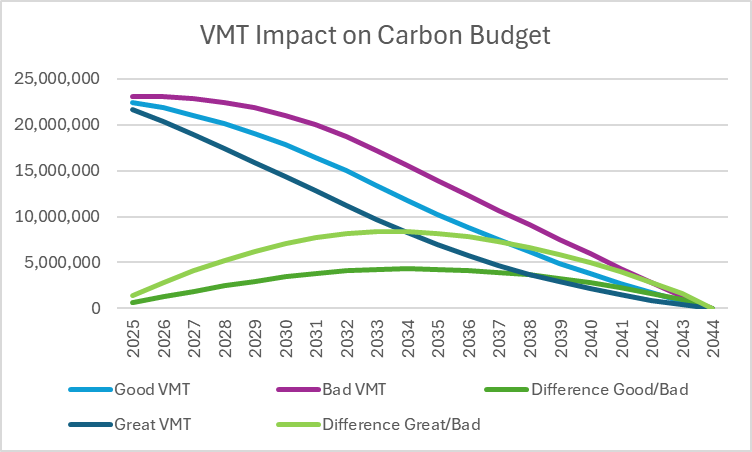 Even if we do get to 100% clean energy and 100% electric vehicles by 2045, it matters how much we emit along the way. Vehicles miles traveled or VMT is the metric used to evaluate the total amount of miles traveled by motor vehicles in a region over a time period. Below is how the transition to electric vehicles and clean energy plays out in emissions under a Bad VMT Trend, a Good VMT Trend, and a Great VMT Trend.