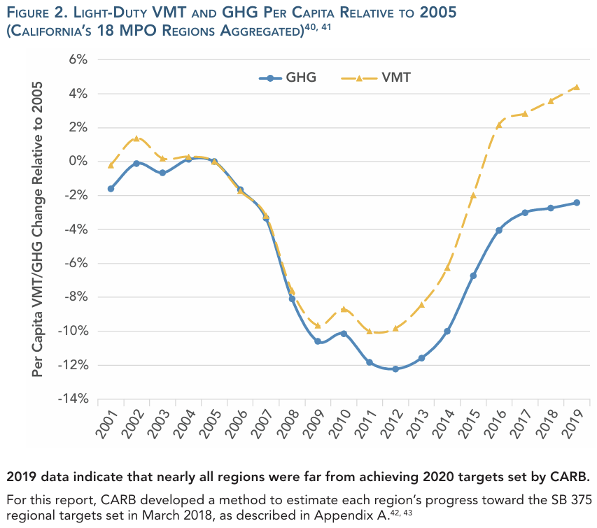 California presents a warning for what happens when land use and other VMT strategies are neglected. Despite California’s early lead in building clean energy, requiring more fuel-efficient cars, low-carbon fuels, and the transition to electric cars, greenhouse gas emissions from transportation have stayed stubbornly high. The reason: Californians keep driving more.