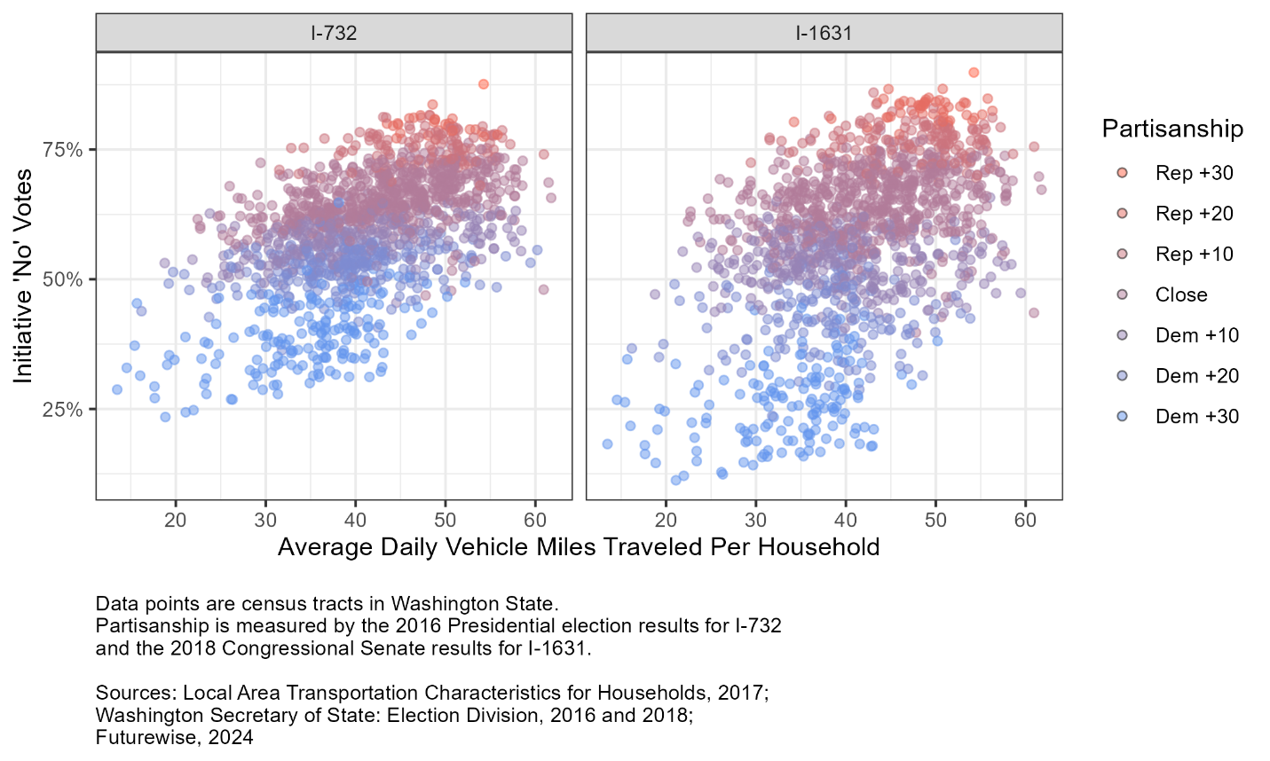 The amount households drive varies a lot by census tract. At one end of the spectrum, the average household only drives about 10 miles per day. At the other end, the average household has to drive 60 miles per day. To understand the relationship between these travel patterns and voting behavior, we can compare the votes, by precinct, for both I-732 and I-1631 to these average daily travel distances for the corresponding census tract. We looked at this relationship on its own and when controlling for partisanship (using 2016 Presidential vote share) because party affiliation is also correlated with average neighborhood travel distances.
