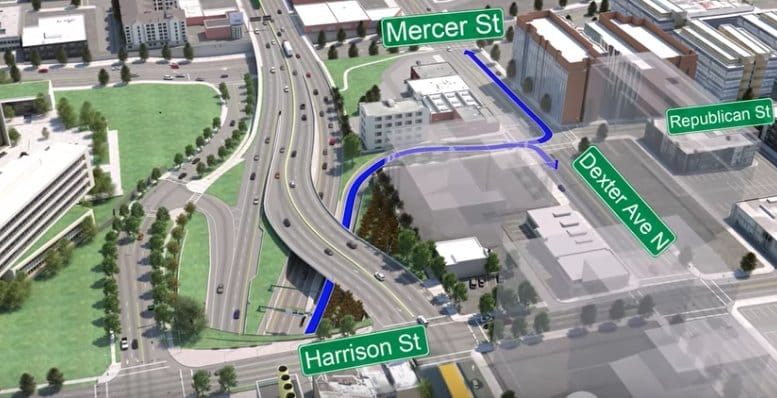 If you’re traveling northbound through the SR-99 tunnel and want to go downtown, drivers will find themselves on Republican Street making a right turn to get onto Dexter Avenue N. Dexter is a very heavily used bike route between Downtown and North Seattle: the route that saw a 40% increase in bike traffic during the first few weeks of a post-viaduct Seattle.