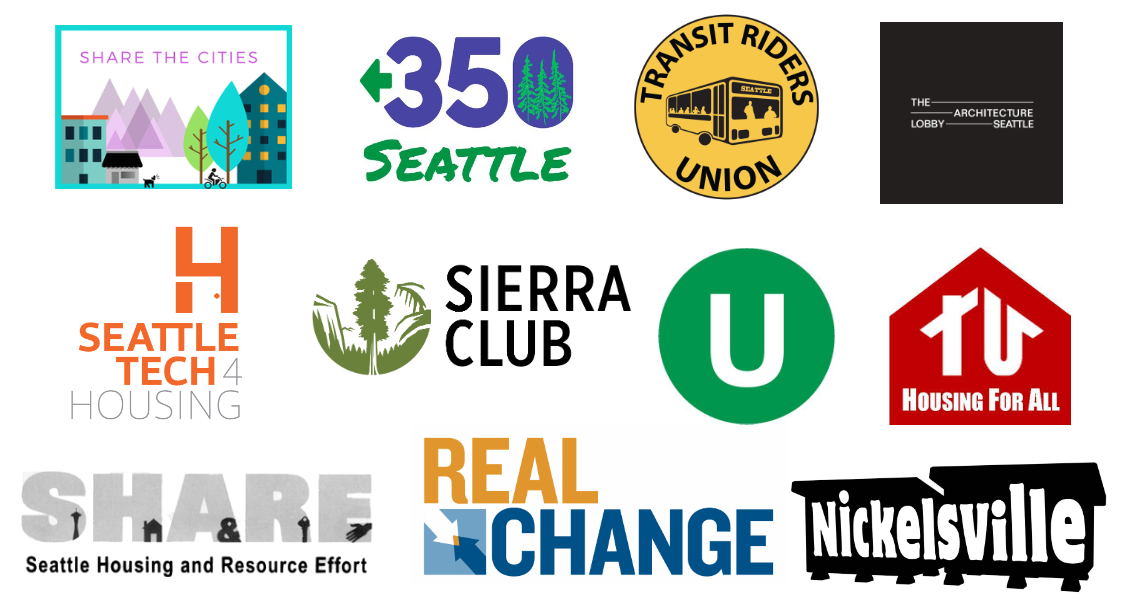 Endorsed by: Share The Cities; Seattle Architecture Lobby; 350 Seattle; Sierra Club Seattle Group; Transit Riders Union; Seattle Tech 4 Housing; The Urbanist; Tenants Union of Washington State; SHARE (Seattle Housing and Resource Effort); WHEEL (Women’s Housing Equality and Enhancement League); Nickelsville; Real Change; Cary Moon; Mike Eliason; Professor Sara Rankin, Director, Homeless Rights Advocacy Project.