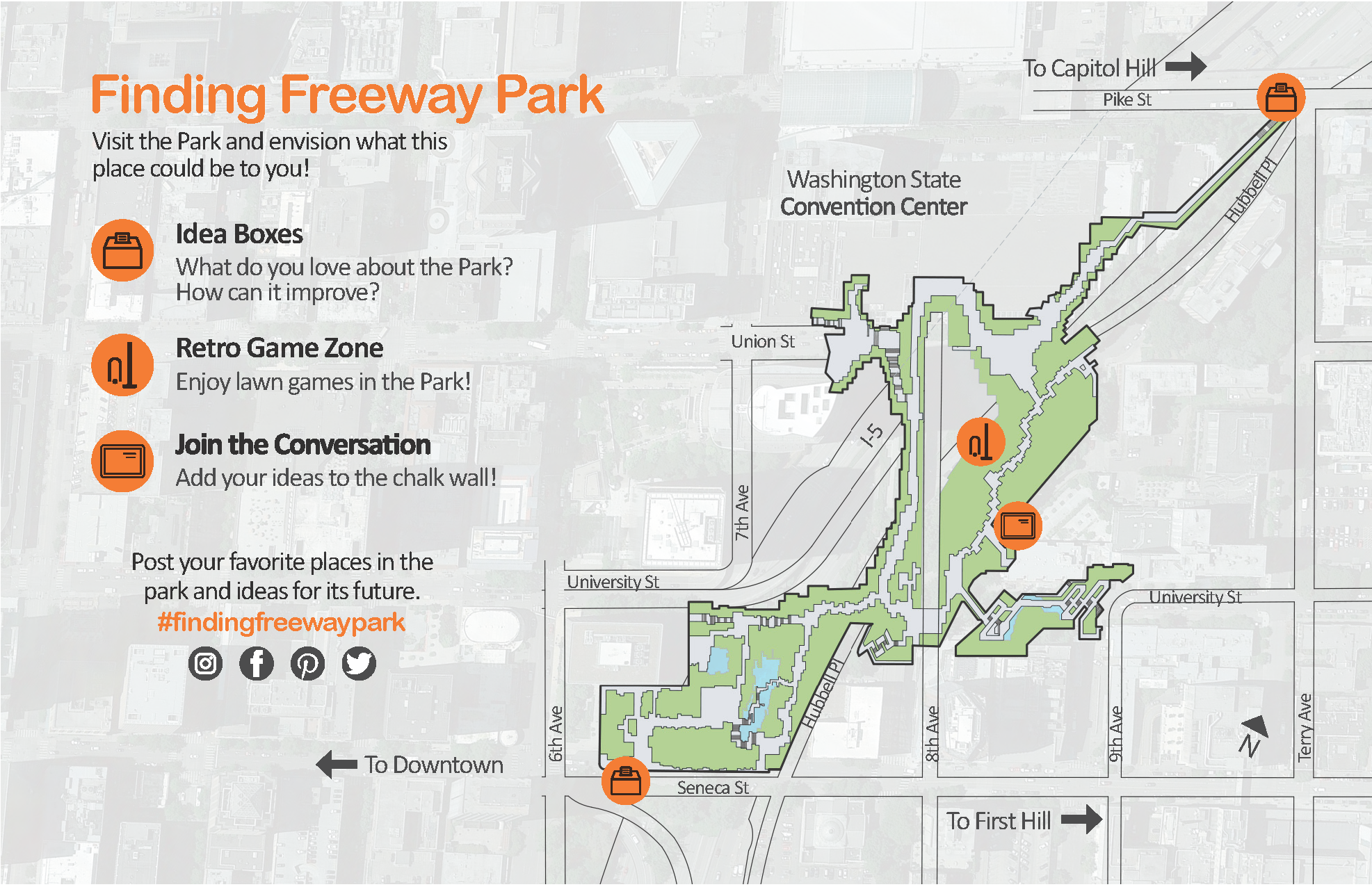 The Finding Freeway Park design initiative is now re-evaluating the park’s position in the urban landscape and how it can better serve Seattle’s rapidly growing population. Click here to read more about the project, see what the ideas are so far, and take an online survey about how you use the park and how it should be improved.